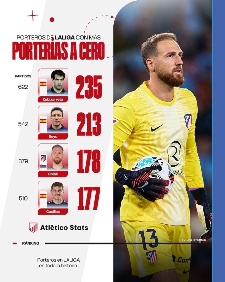 Oblak is third in the La Liga clean sheet rankings, surpassing Casillas, and in fewer matches than the latter.