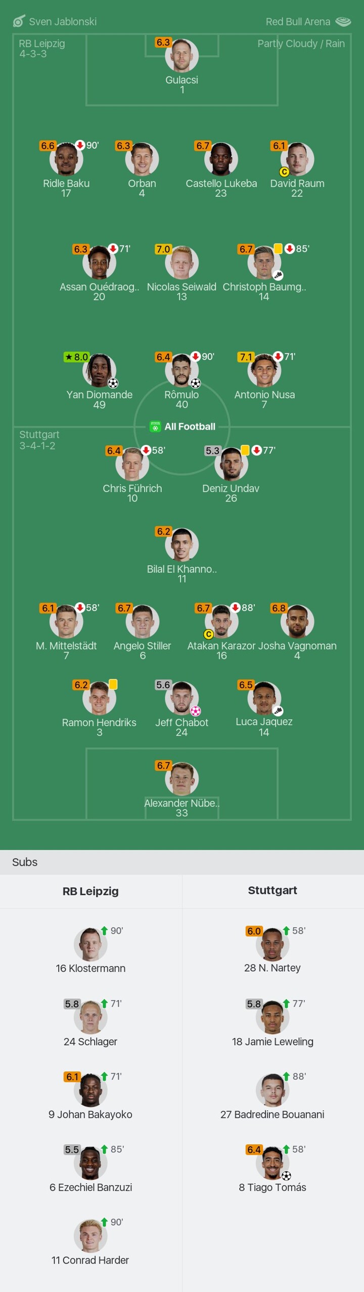 We bring you the player ratings for RB Leipzig vs Stuttgart as Yan Diomande becomes Man of the Match with a rating of 8.0. Copyright Declaration