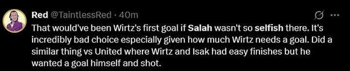 One wrote: 'That would've been Wirtz's first goal if Salah wasn't so selfish there. It's incredibly bad choice especially given how much Wirtz needs a goal.