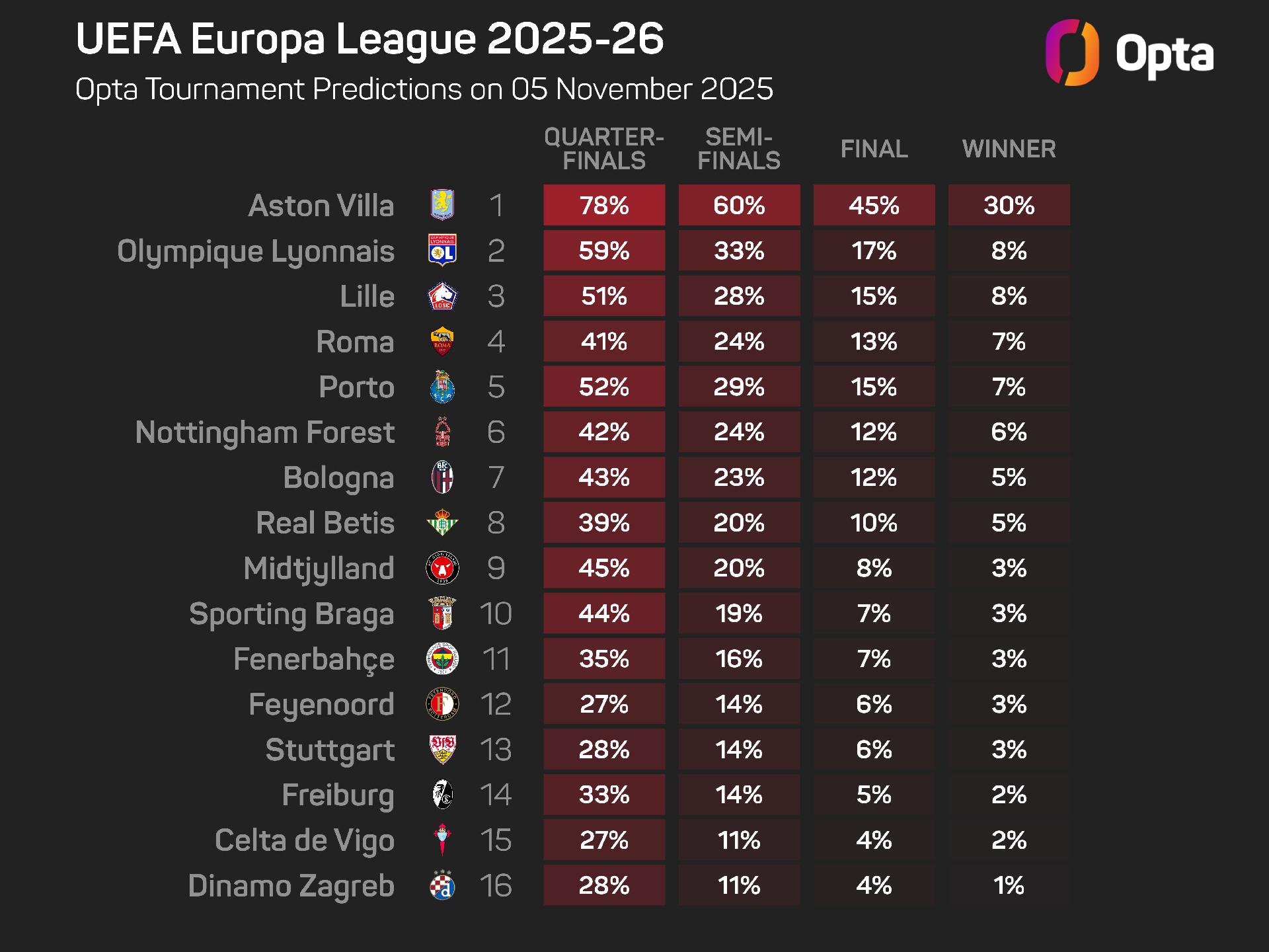 Despite their current position, Villa are favourites to win the Europa League this season, according to the Opta supercomputer, with a 30% chance of lifting the trophy.