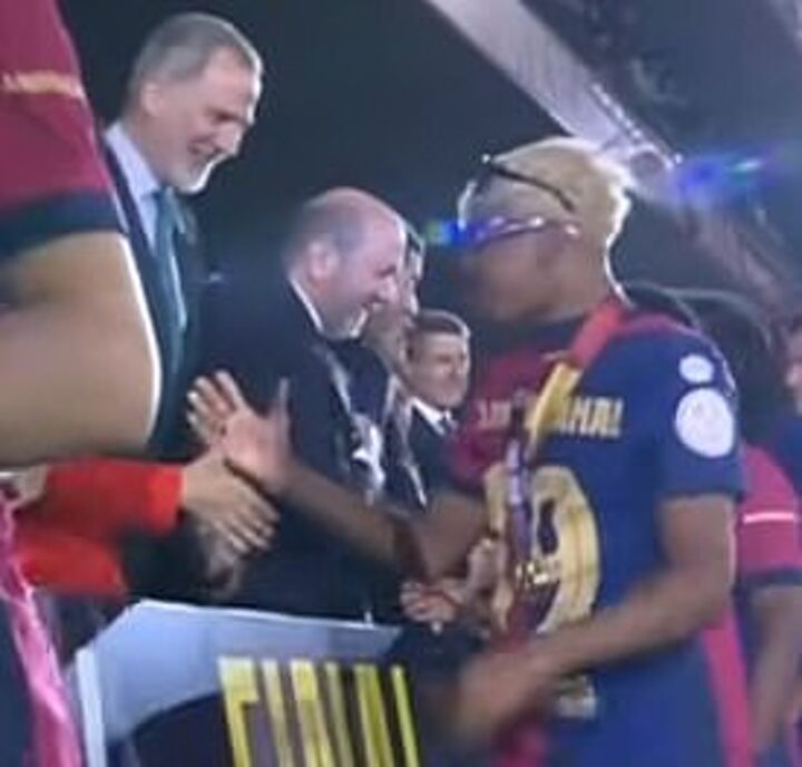 Instead of offering a traditional handshake to Felipe VI, Yamal — sporting two pairs of sunglasses and a backwards shirt — chose to 'dap' His Majesty.