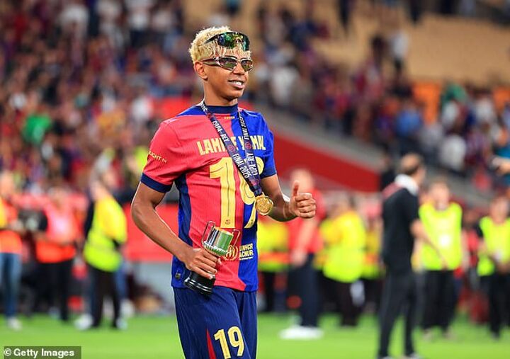 Yamal continued to do the same action down the line, including with Barca president Joan Laporta, who reached forward to hug his side's star man on the back of their success.
