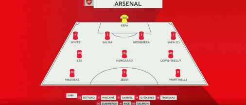 Arsenal XI: Christian Nørgaard, Kepa, Jesus, Ben White, Eberechi Eze, Martinelli, Saliba, Saka, Madueke, Cristhian Mosquera, Lewis-Skelly