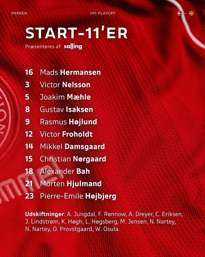 Denmark XI: Hermansen, Nelsson, Maehle, Isaksen, Hojlund, Froholdt, Damsgaard, Norgaard, Bah, Hjulmand, Hojbjerg