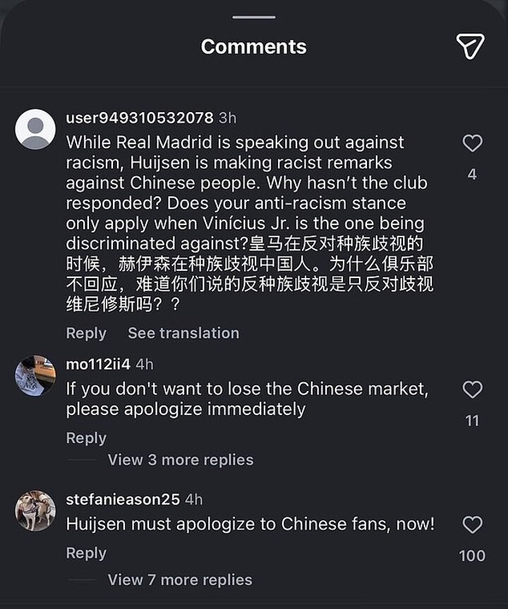 Other users flocked to the comments to demand the apology, with one posting: 'While Real Madrid is speaking out against racism, Huijsen is making racist remarks against Chinese people. Why hasn't the club responded?