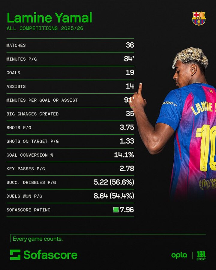 Yamal has reached the feat at just 18 years and 237 days old - two years quicker than Messi (20 years and 315 days) and three years earlier than Ronaldo (21 years and 297 days).