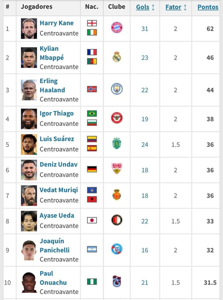 10. Onuachu (Trabzonspor) 21 goals 31.5 points (coefficient 1.5)