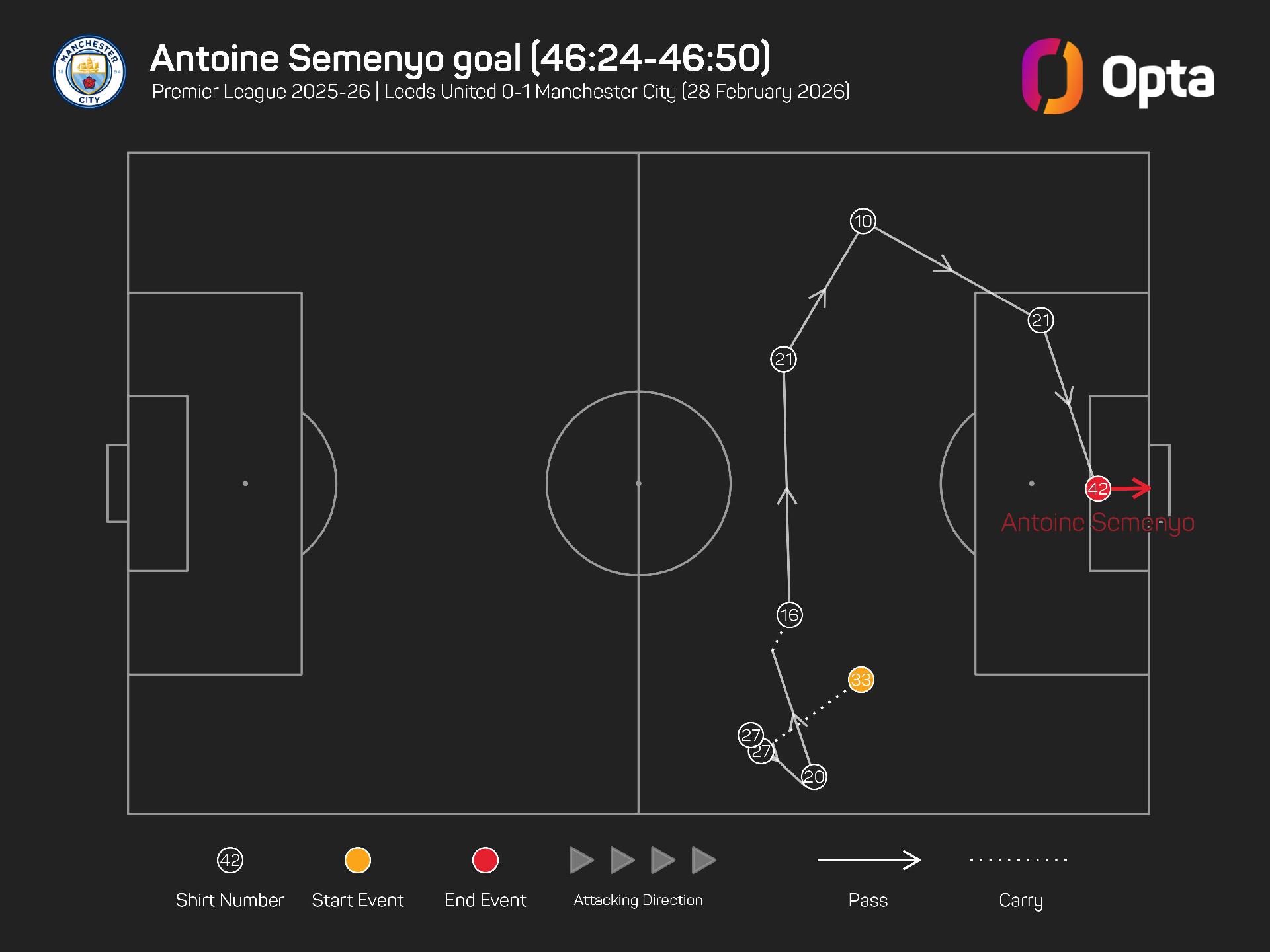 47' GOAL! Semenyo opens scoring from Aït-Nouri's cross! Leeds United 0-1 Man City