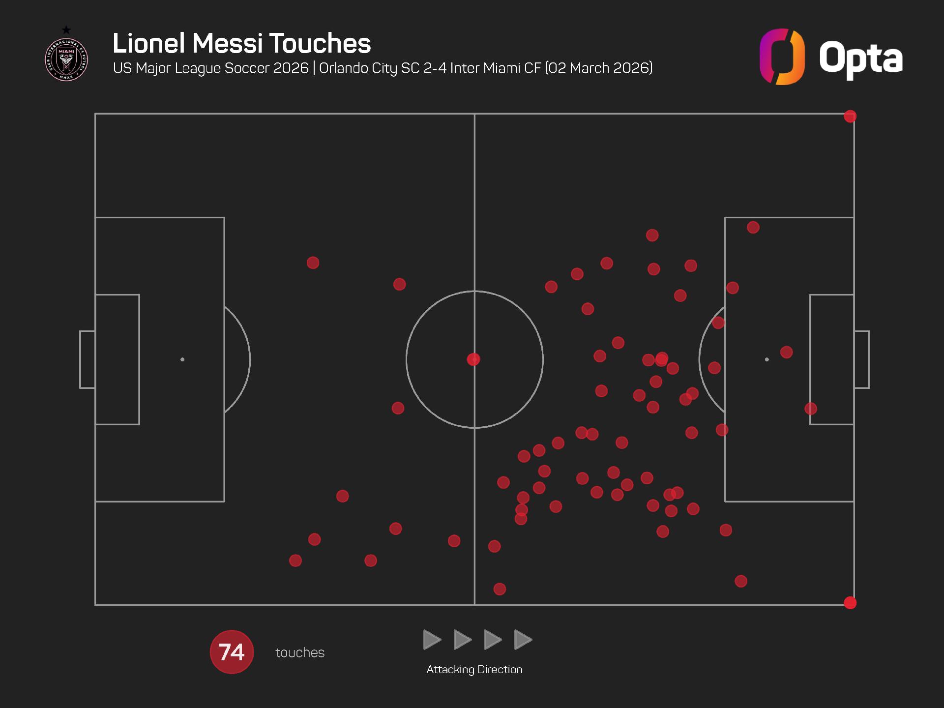Miami finished Sunday's game with 1.79 expected goals (xG), with Messi responsible for 1.36 xG from that figure.
