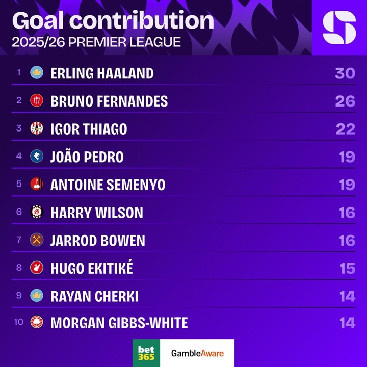 According to Squawka Football's latest statistics, Erling Haaland leads this season's goal contribution in the Premier League. In total, he contributed to 30 goals(23 scored, 7 assisted) on the pitch. The Norwegian is also the first player to reach this number.
