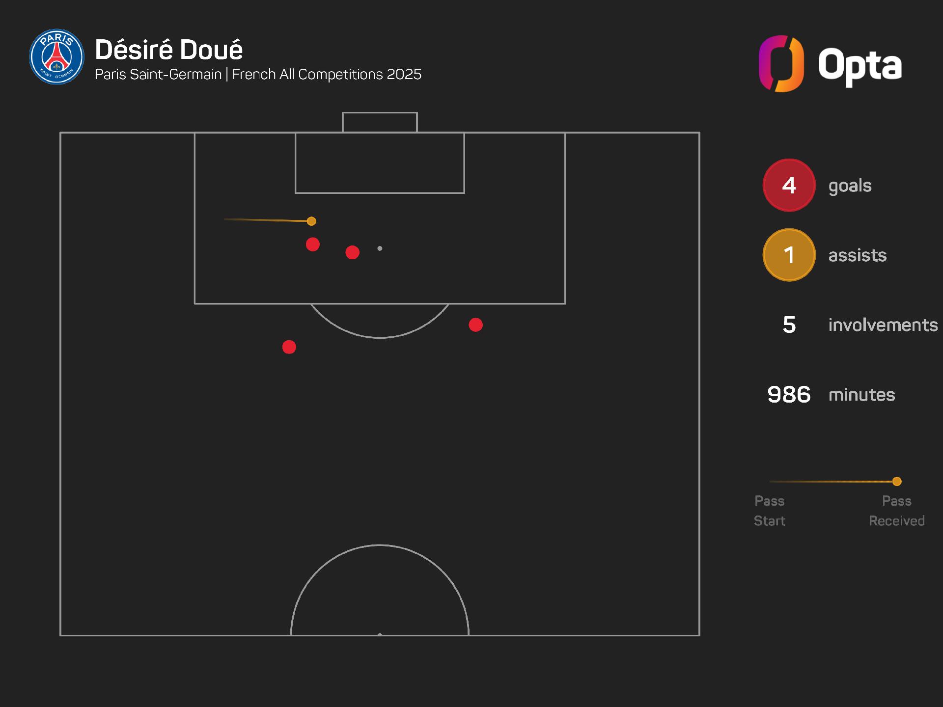 Doue has scored four goals for PSG in all competitions this season, with only one of those coming in the league, netting his tally from 2.3 expected goals (xG).