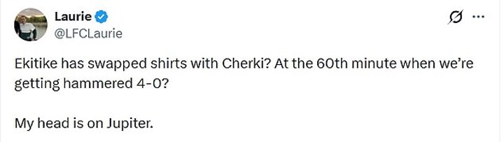 Another added: 'Ekitike has swapped shirts with Cherki? At the 60th minute when we're getting hammered 4-0? Shocking. Club is in the gutter.'