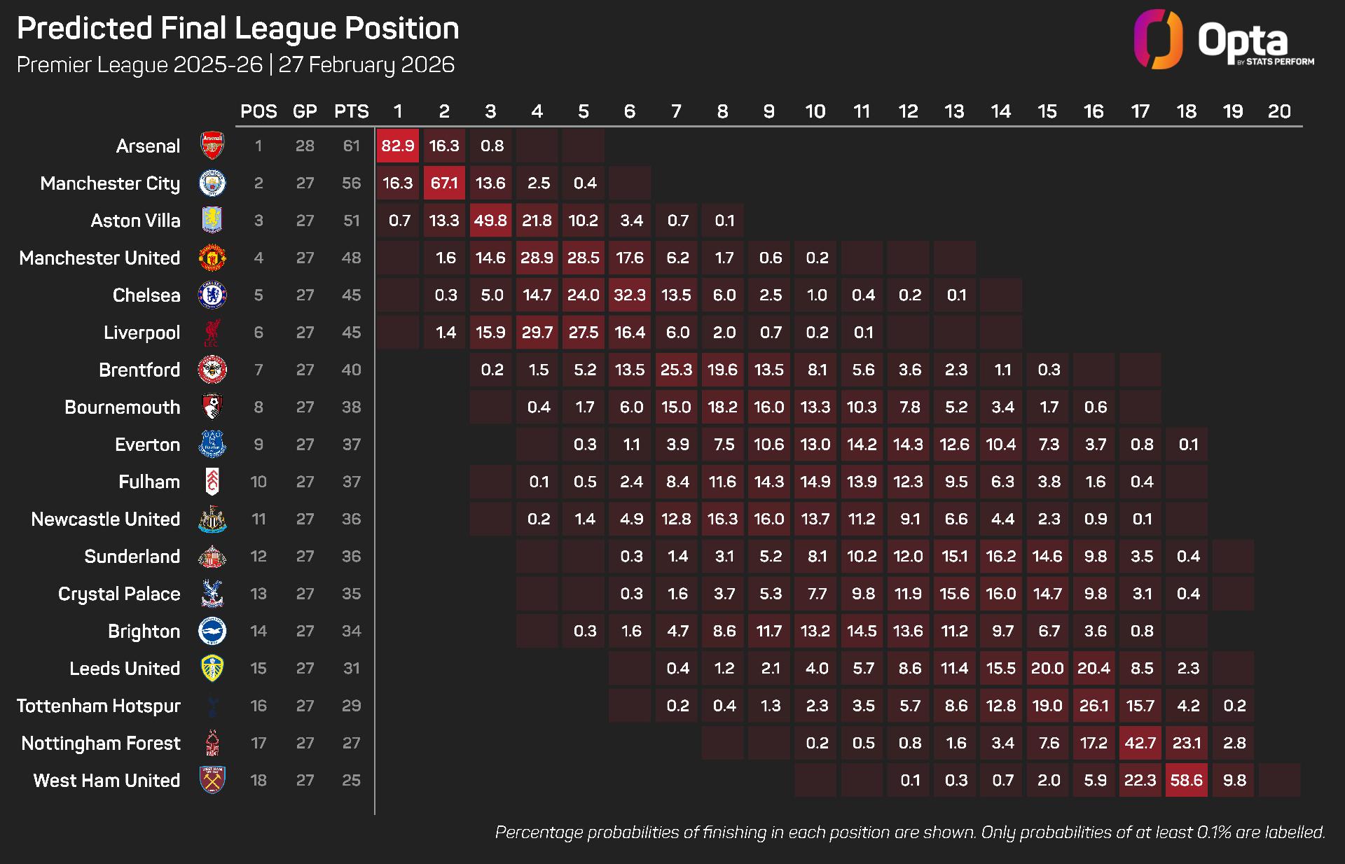 And given their run of upcoming fixtures, the Opta supercomputer has handed Chelsea a 20% chance of finishing in the top four, though with fifth place looking like it will also seal a Champions League spot, their probability rises to 44%.