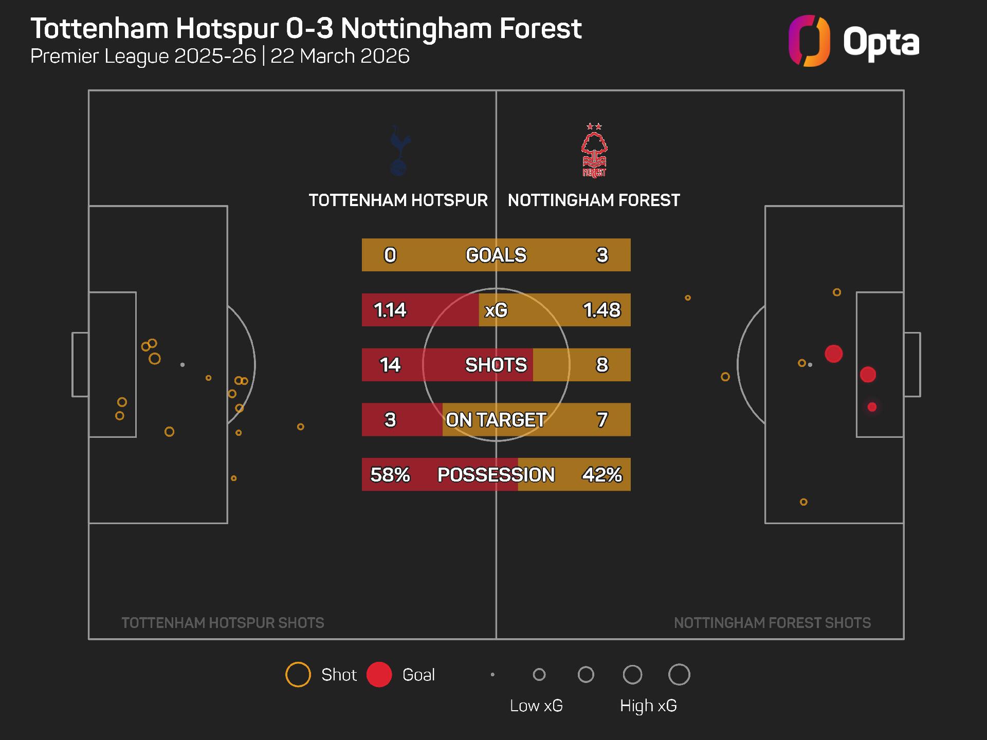While they only had eight shots to Spurs' 14, Forest did provide the bigger goal threat, getting seven efforts on target.