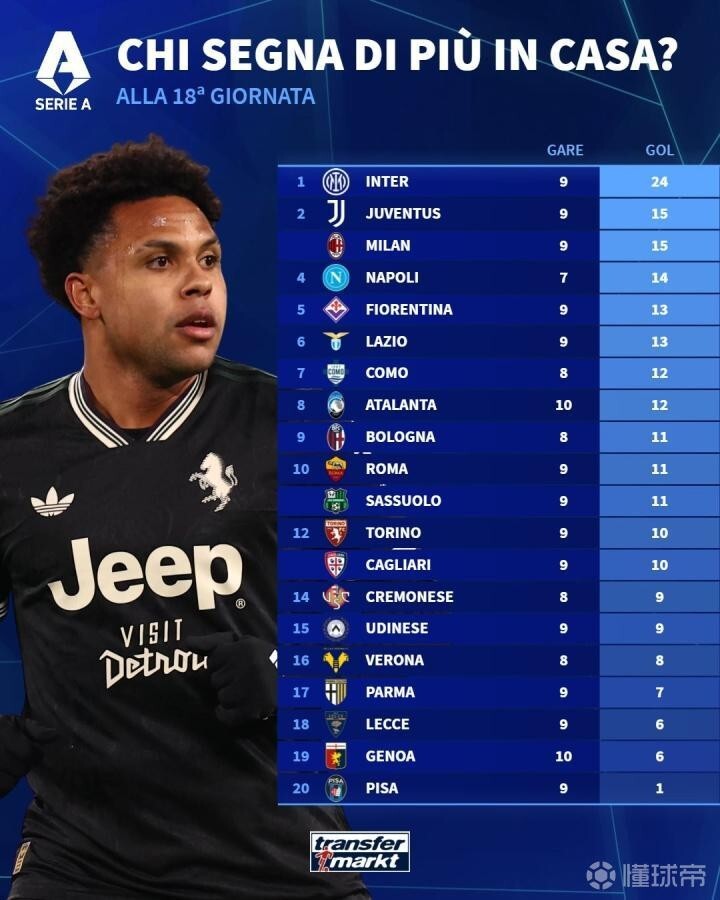 After 18 matchdays of the Serie A season, Transfermarkt has published the league’s home goals ranking. Inter Milan top the list by a significant margin, having scored 24 goals in 9 home matches. Juventus and AC Milan are tied for second place, each with 15 goals in 9 home games.