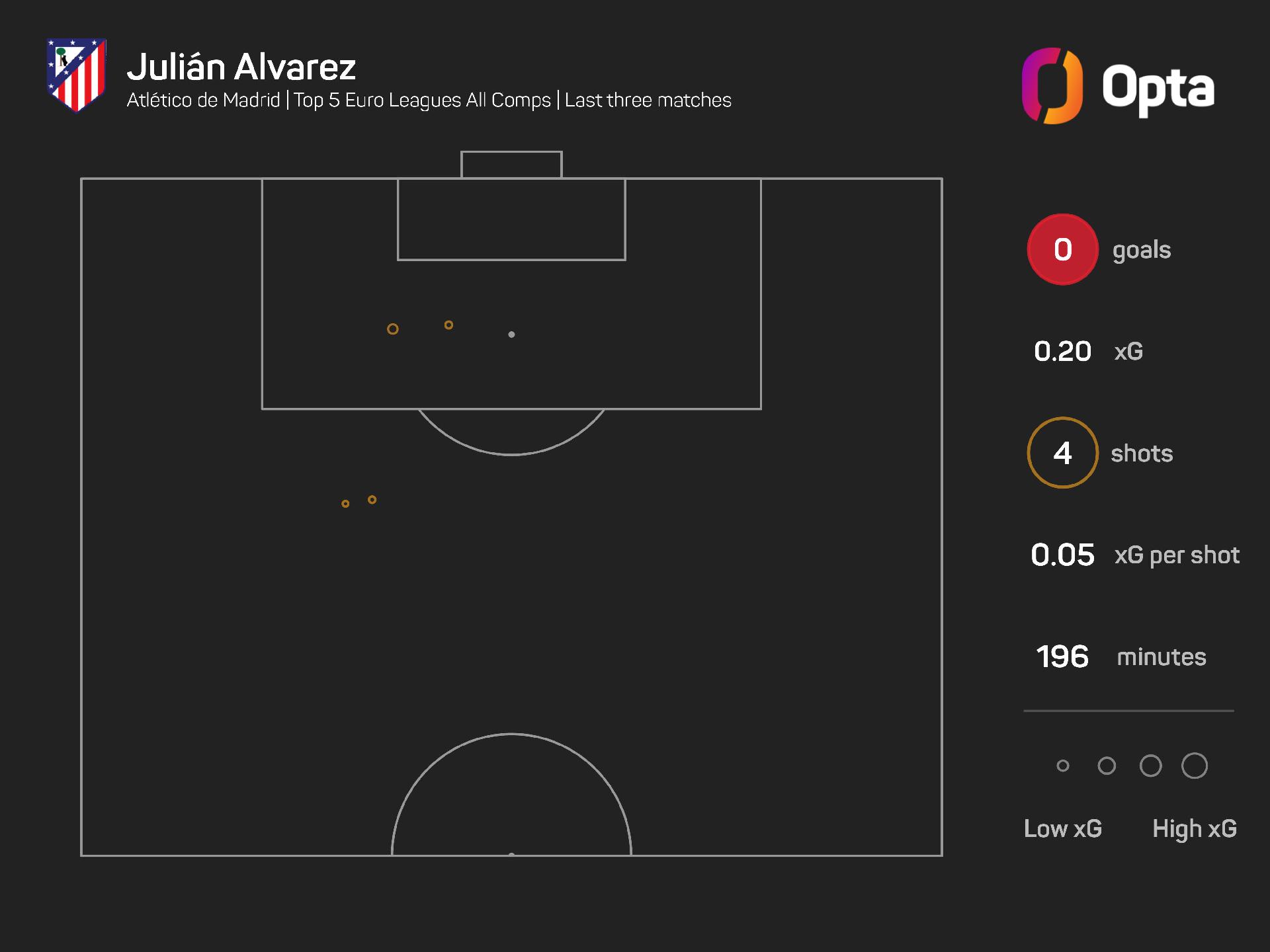 The Argentine leads all Atleti players for goals (11) and goal involvements (17 – six assists) in all competitions this season, but he has now gone three matches without scoring and has only hit the net once in his last seven outings.