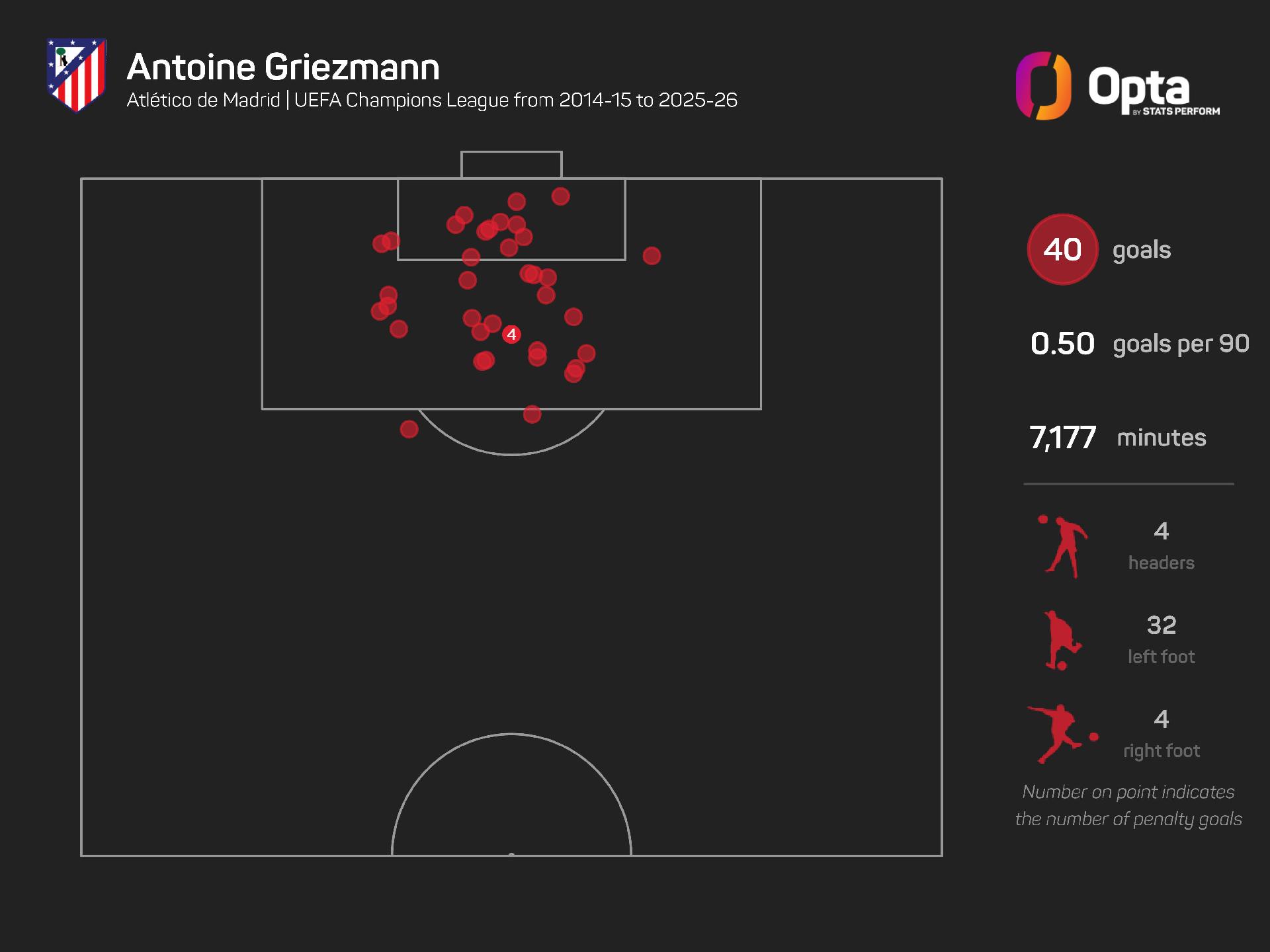 Griezmann, who will be desperate to lift silverware with Atleti before leaving for Orlando City at the end of the season, has been directly involved in 24.2% of Los Colchoneros' all-time goals in the Champions League (56/231 – 40 goals, 16 assists).