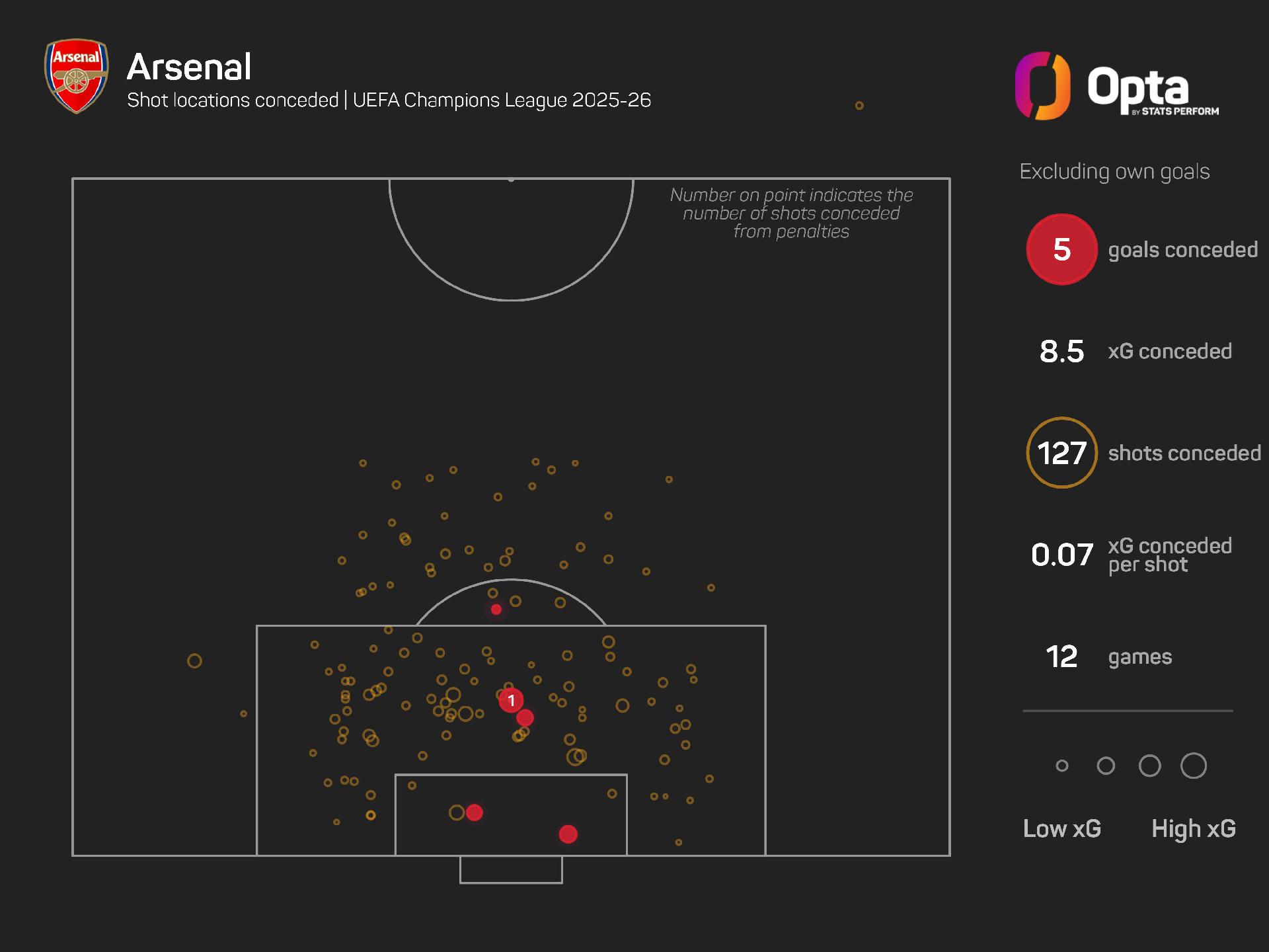In the 22 Champions League games that David Raya, William Saliba and Gabriel Magalhaes have started together, Arsenal have only conceded 11 goals (0.5 per game) and kept a clean sheet on 13 occasions (59%).