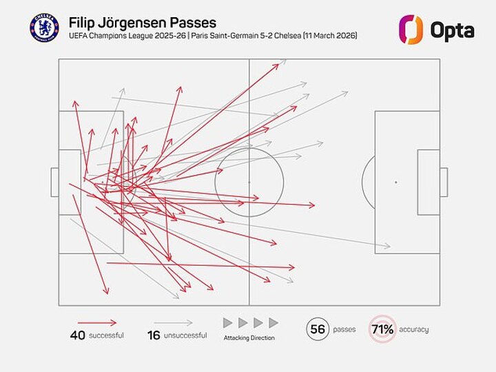 Bold though Rosenior’s decision was, it backfired. Jorgensen’s passing from the back even led to Chelsea players losing patience, with Enzo Fernandez angrily throwing the ball at him when PSG scored an eventually disallowed goal. The Parisians still finished with five to leave Chelsea requiring a miracle comeback in Tuesday's second leg at Stamford Bridge.
