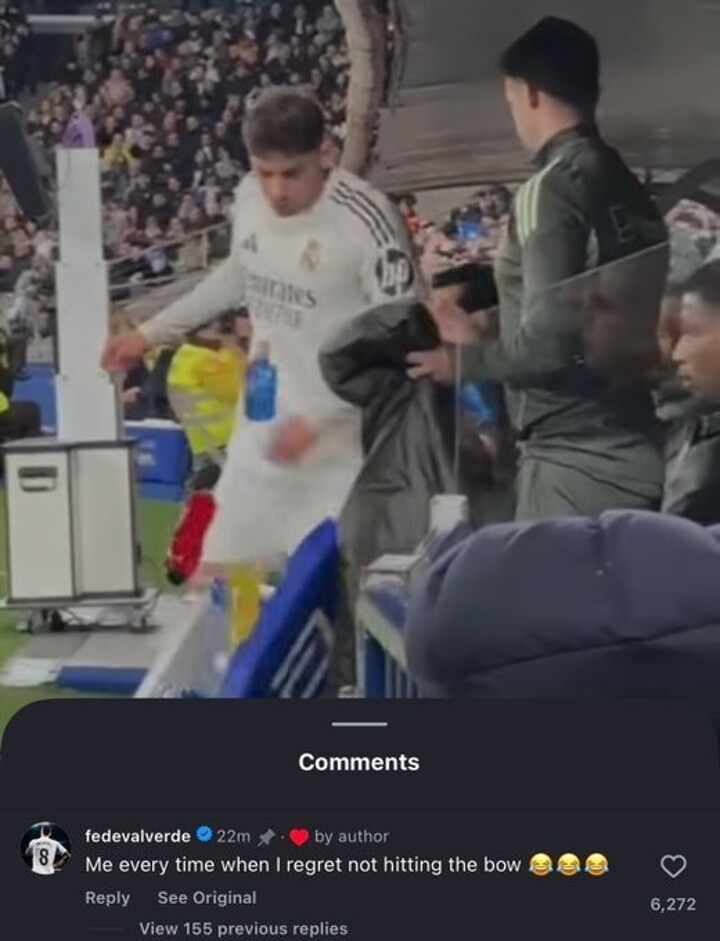 Valverde himself also responded on social media after the game. He commented on social media, saying: "Me every time when I regret not hitting the bow."