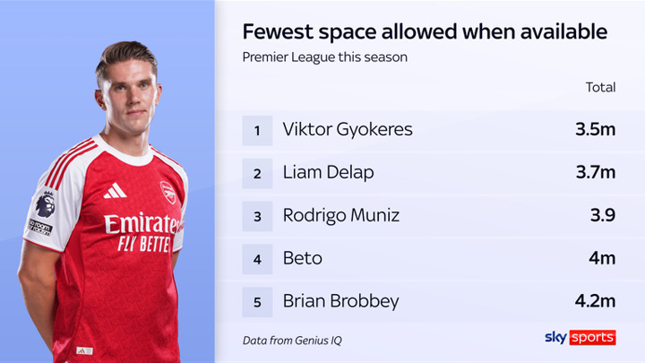 That is because of a few reasons. Firstly, Gyokeres attracts other defenders like no other Premier League player. Tracking data from this season shows the Arsenal striker is afforded the least amount of space when he's available to be given the ball.