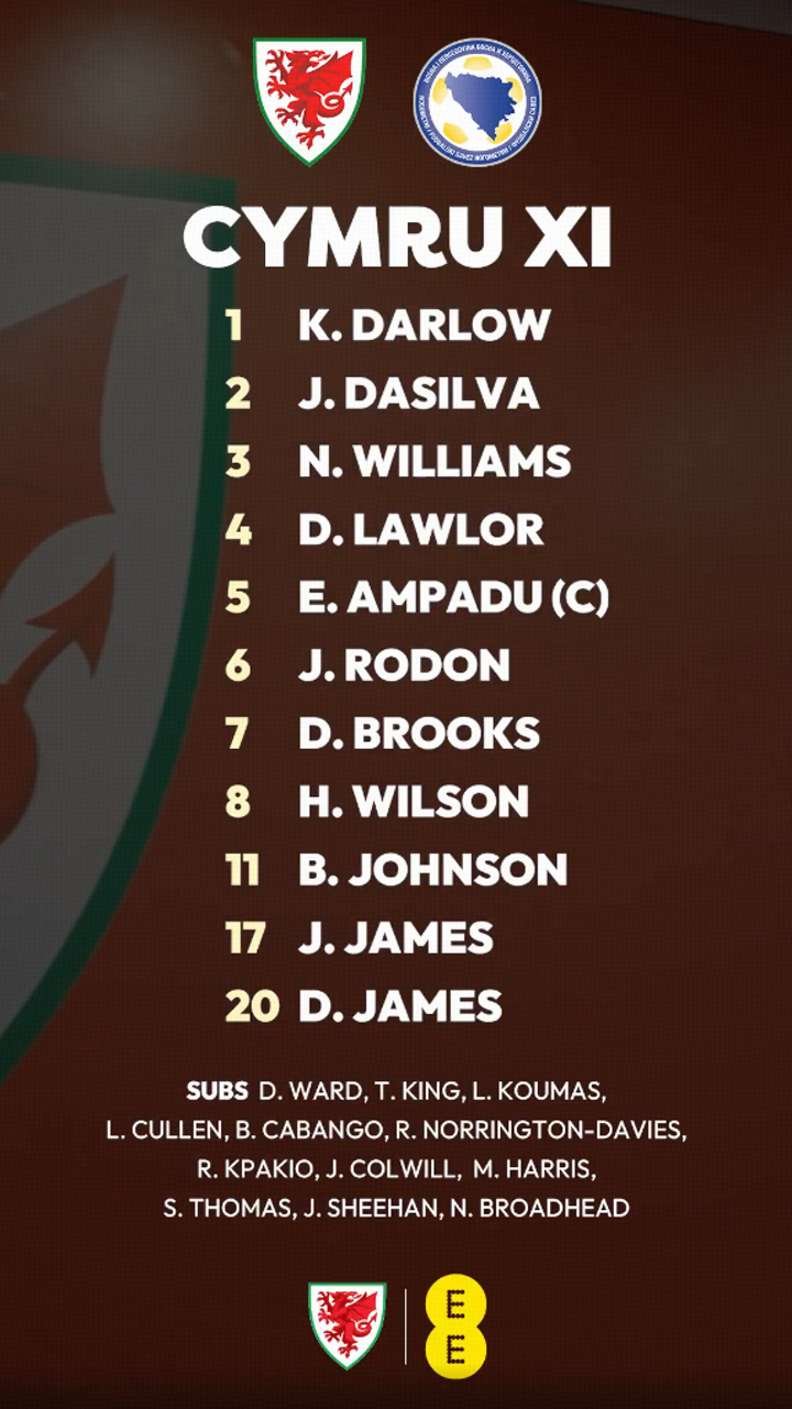Wales XI: Darlow, Dasilva, Neco Williams, Lawlor, Ampadu, Rodon, brooks, Wilson, Brennan Johnson, James, D. James